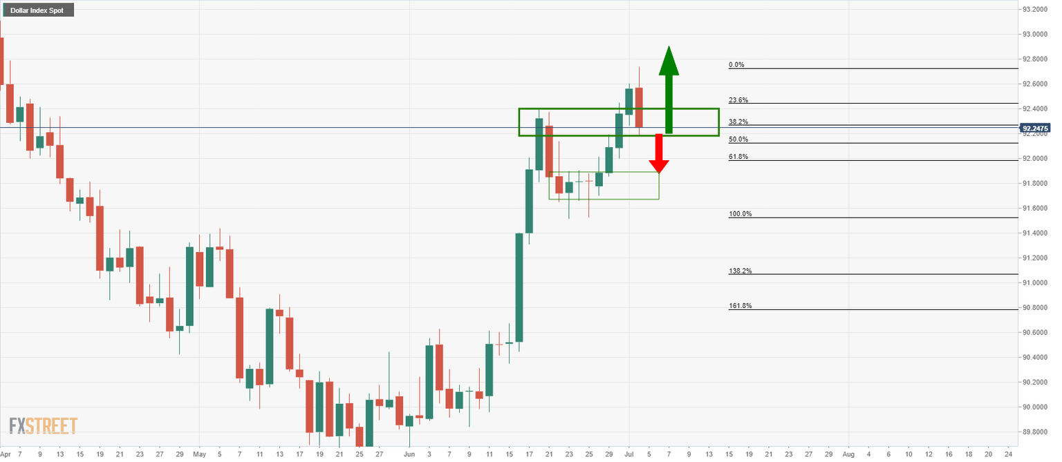 - DXY needs to give out at daily support to help gold bulls towards the daily 38.2% Fibo target.