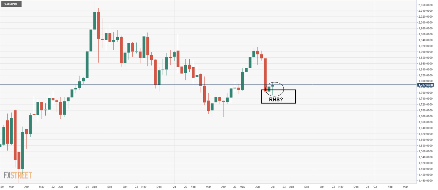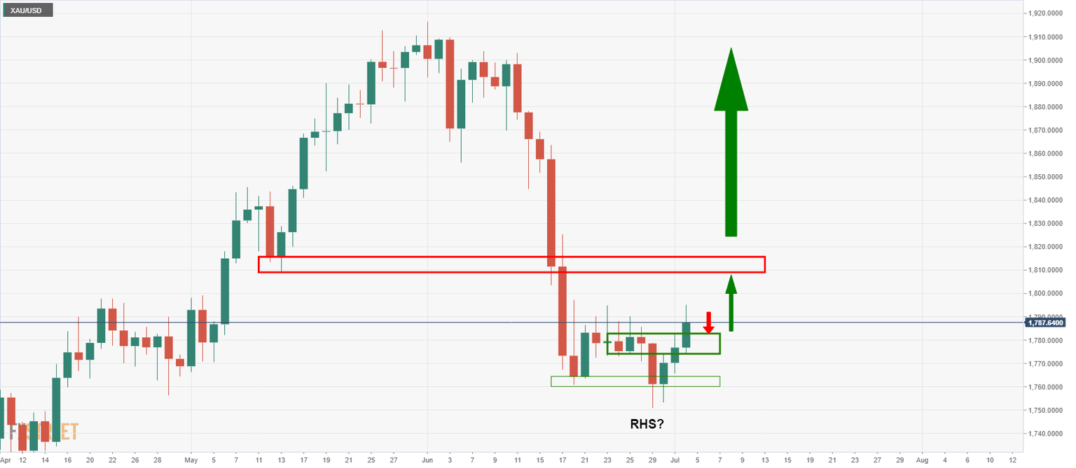 meanwhile, the price is seeking an extension above the highs at this juncture which opens the case for 1,808 as being the 38.2% Fibo of the last daily bearish impulse which has a confluence with the 13th May lows.