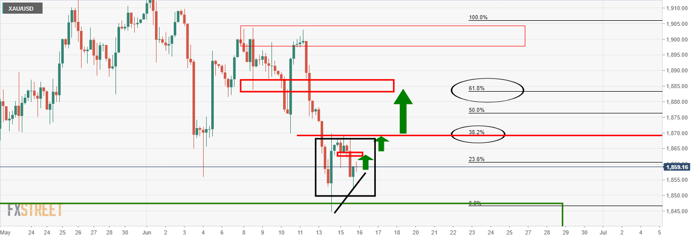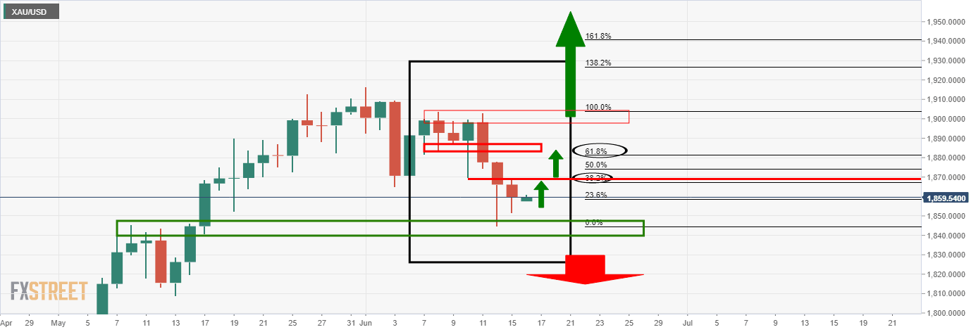 XAU/USD was trading between a range of $1,851.66 and $1,869.20. At the time of writing, the price is flat and establishing with a technical bias to the upside.