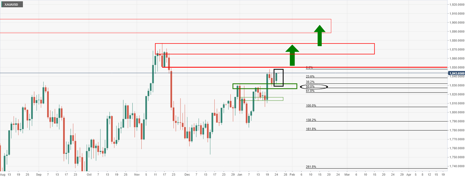 As per the pre-open analysis this week, Gold, Chart of the Week: Bulls pining for $1,850+, could be just a Fed away, the price has been moving in on critical resistance: