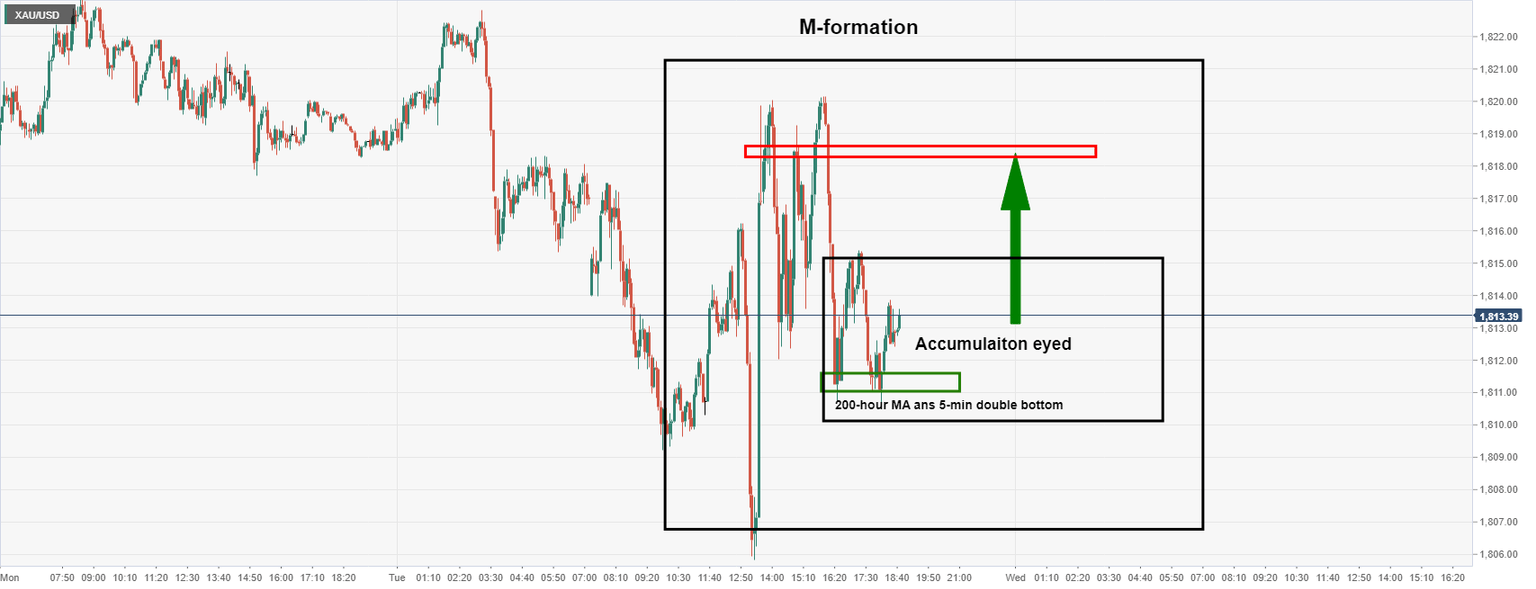The price is already holding in bullish territory as per the 200-hour moving average. The M-formation is a reversion pattern that has a high completion rate. The price is often drawn in by the neckline of the formation, in this case, this comes in at $1,818.