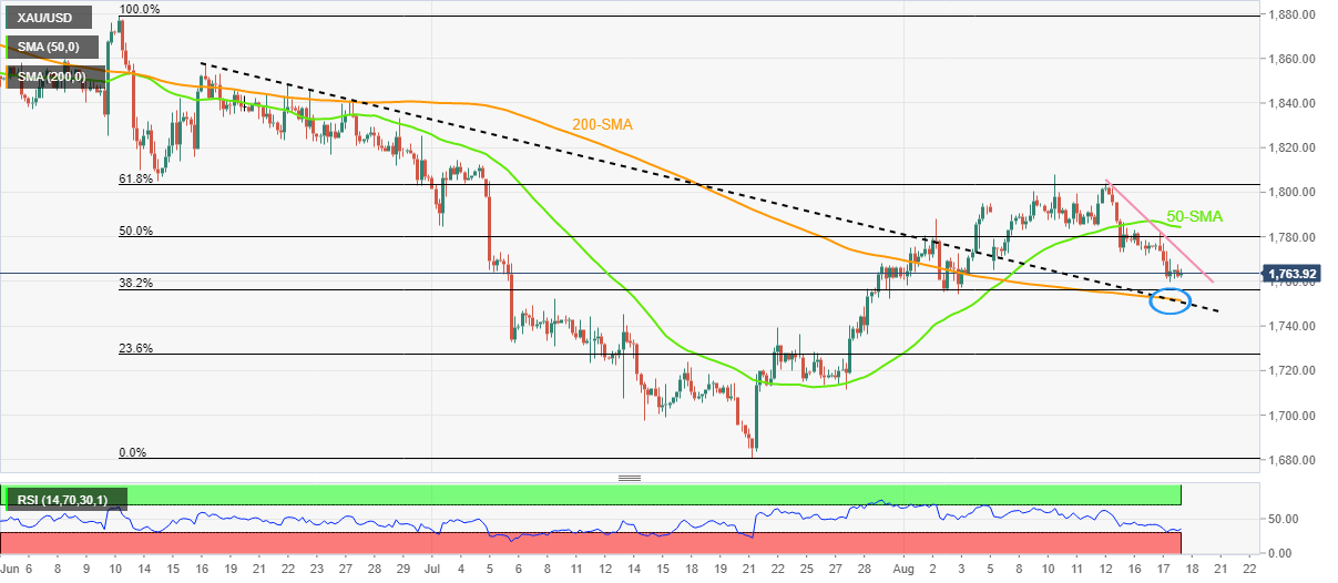 Gold price (XAU/USD) prints mild gains during the sluggish trading session amid early Thursday morning in Europe. In doing so, the bright metal snaps a four-day downtrend while bouncing off the weekly low, up 0.15% intraday near $1,764 by the press time.