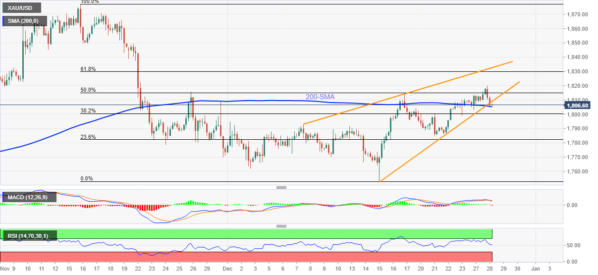 Gold prices confirmed a rising wedge bearish chart pattern the previous day on the four-hour play but the 200-SMA level near $1,805 probes the sellers.