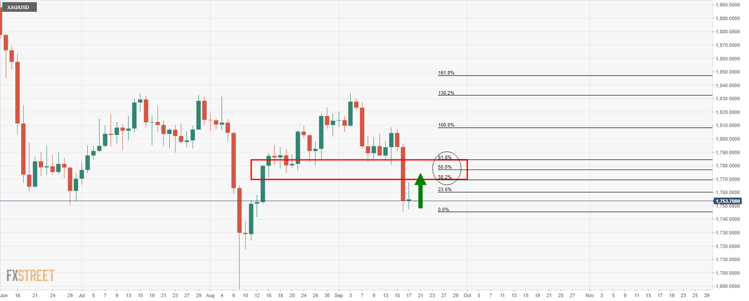 The price is correcting from last week's low of $1,745 that was made o the back of a firmer greenback. The dollar scaled three-week peaks on Friday, supported by better-than-forecast US Retail Sales data released on Thursday ahead of this week's Federal Reserve meeting.