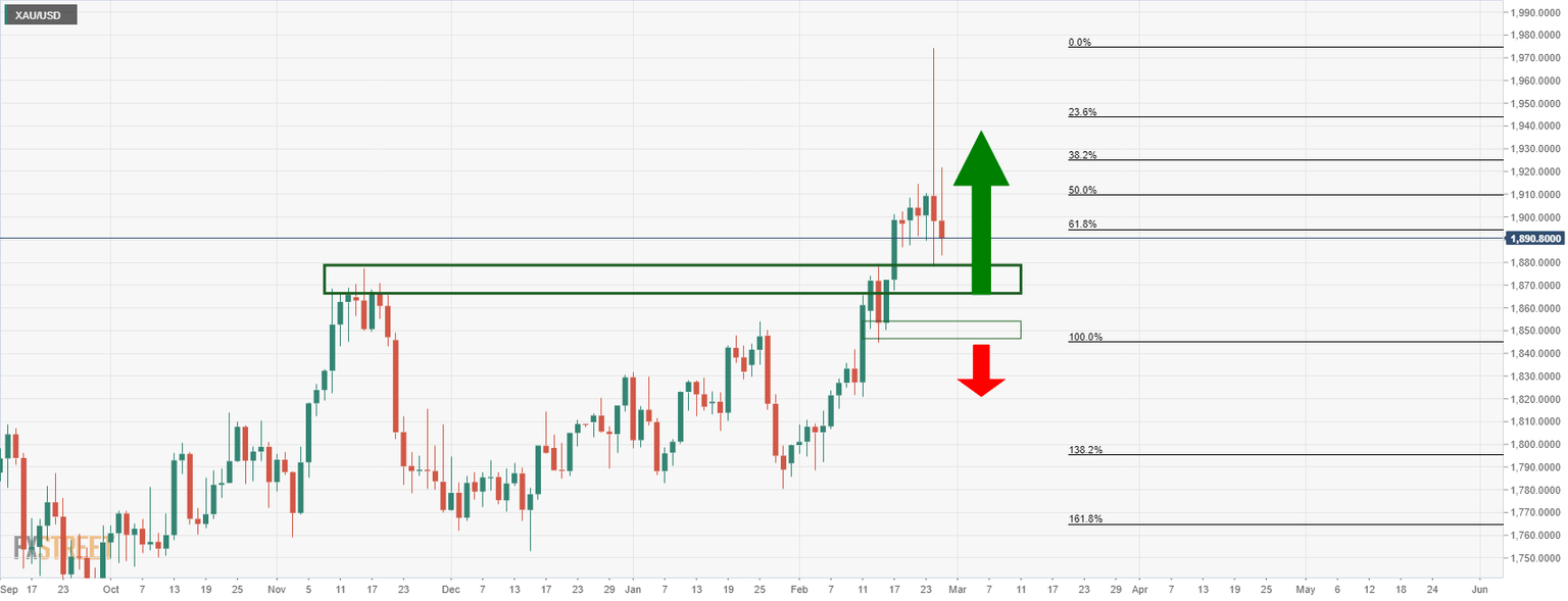 The price is testing a key daily support area that guards risk to below $1,844, However, should the bulls commit at this juncture, an upside continuation would be expected for the near future.