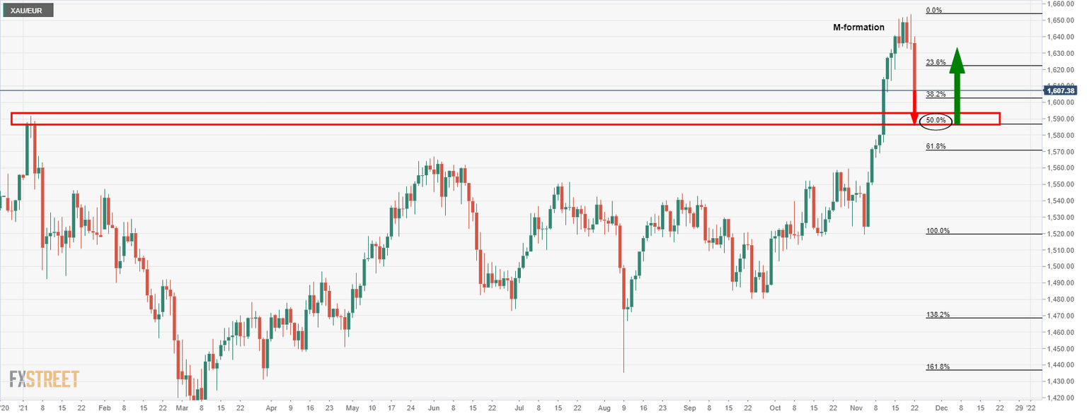 - XAU/EUR bears are in control and eye the test of $1,590 in a 50% mean reversion.