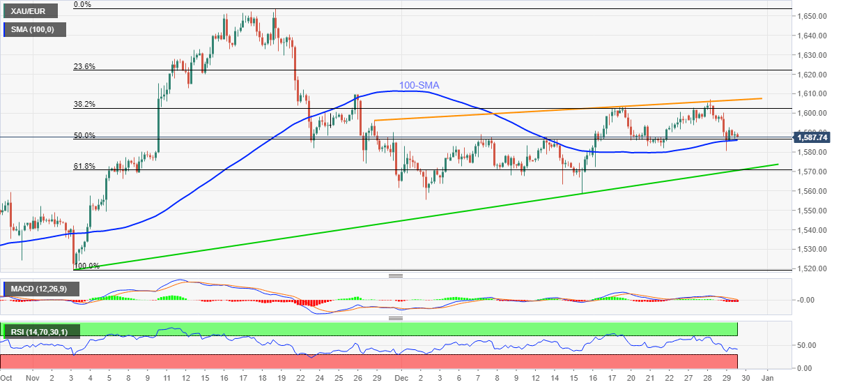 However, a convergence of the 100-SMA and 50% Fibonacci retracement (Fibo.) of November’s upside challenges the metal’s immediate declines around €1,586.