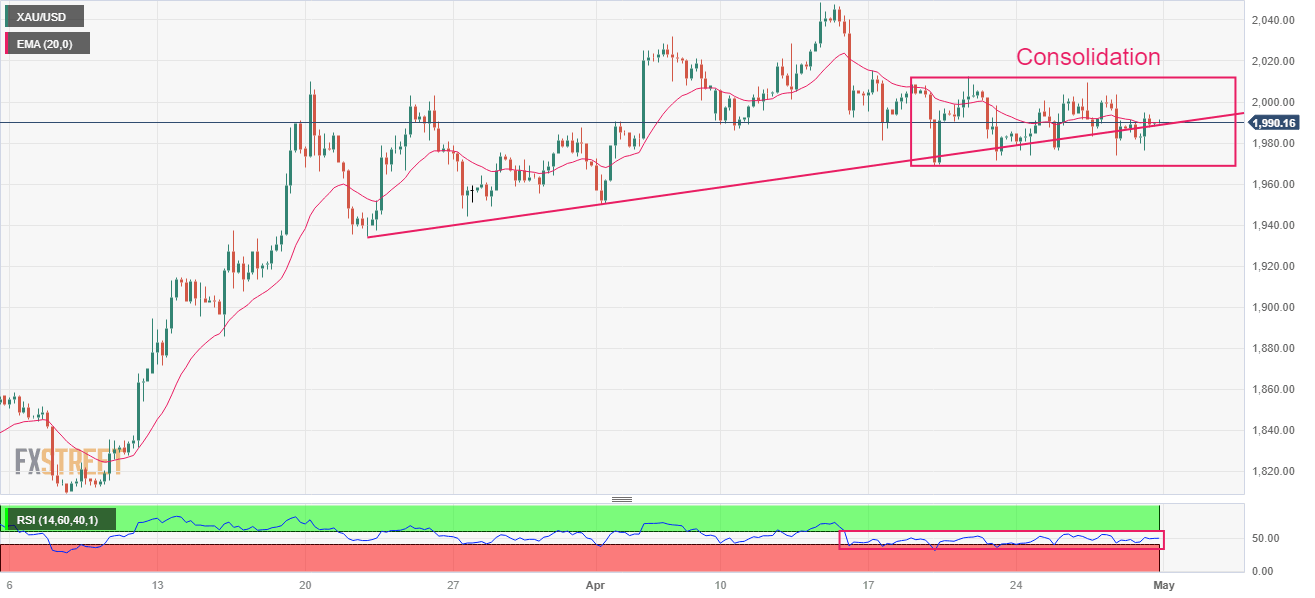 Gold price (XAU/USD) is hovering around $1,990.00 in the early Asian session. The precious metal is struggling to find any direction as investors are awaiting the announcement of the interest rate decision by the Federal Reserve (Fed). The yellow metal is bounded in a range of $1,970-2,010 from the past week as investors are anxious about knowing the importance of May’s monetary policy meeting.