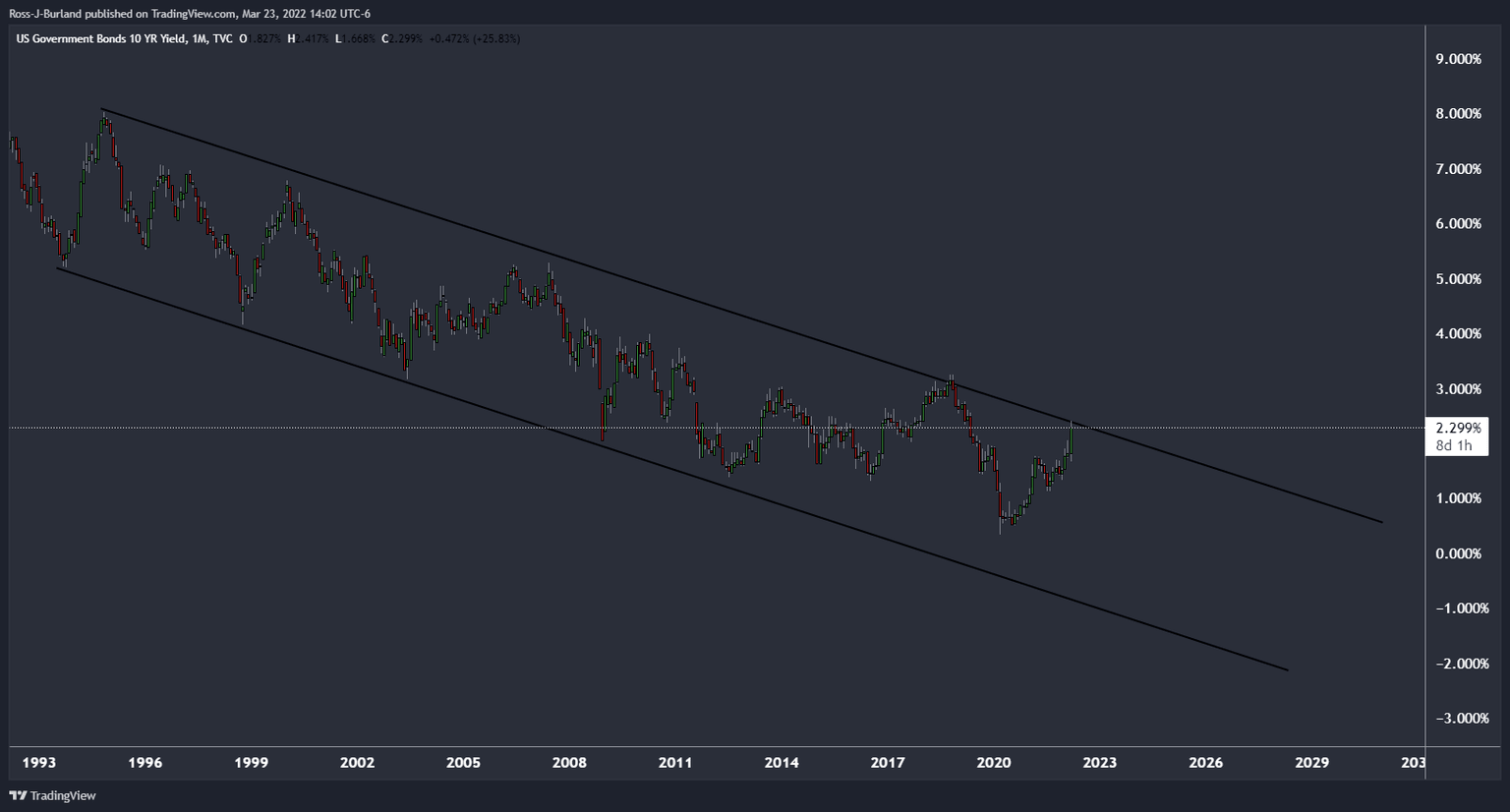 The above chart illustrates the trend channel as the 10-year yield move sin towards 2.5%.
