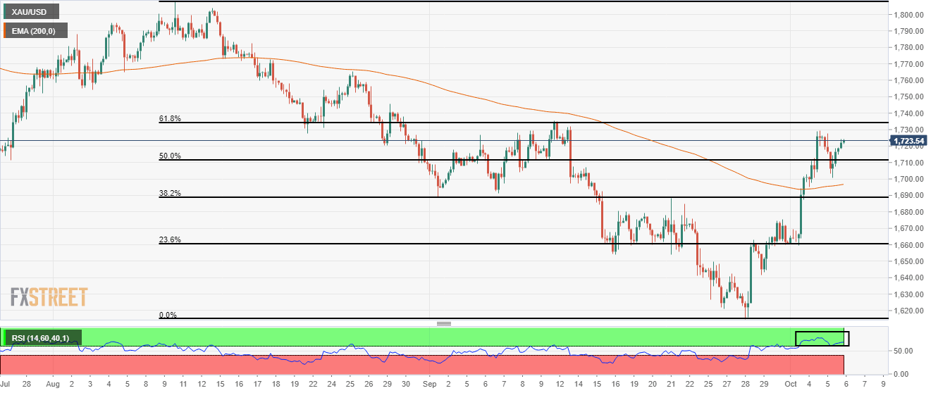 On an hourly scale, gold prices are marching towards the 61.8% Fibonacci retracement (from August 10 high at $1,807.93 to September low at $1,614.85) at $1,734.58. The 200-period Exponential Moving Average (EMA) at $1,697.00 has tilted towards the north, which indicates more upside ahead.