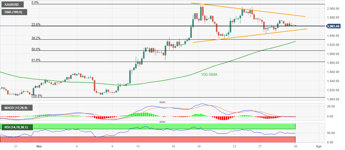 Gold price (XAU/USD) prints mild losses around $1,963 as bulls and bears jostle within a short-term symmetrical triangle ahead of the key inflation release. It’s worth noting that the US Dollar’s rebound allowed the XAU/USD to lure bears the previous day but mixed comments from the Federal Reserve (Fed) officials and the absence of important United States data, not to forget the risk-on mood, challenge the Gold sellers amid Thursday’s sluggish Asian session.
