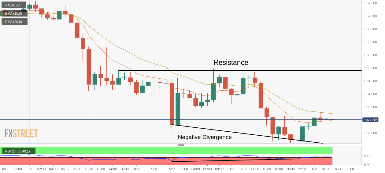 The asset has crossed the 20-period Exponential Moving Average (EMA) at $1,629.43 and is oscillating the 50-EMA around $1,632.35. The horizontal resistance is placed from Monday’s high at $1,649.83.