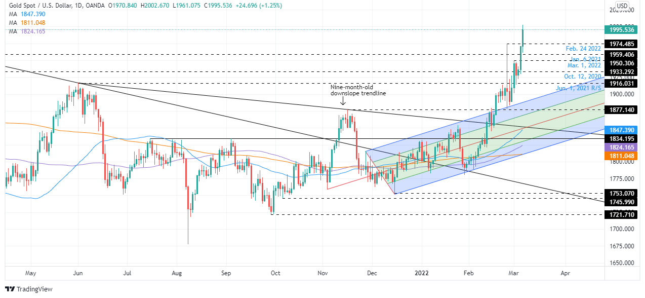- During the day, XAU/USD reached a YTD high at $2002.67 for the first time since August 2020.