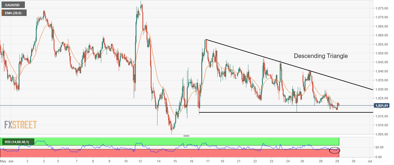 The gold prices are trading in a Descending Triangle pattern that signals a volatility contraction. The downward sloping trendline is plotted from June 16 high at $1,857.58 while the horizontal support is placed from June 16 low at $1,815.73. The gold bulls have attached the 20-period Exponential Moving Average (EMA) at $1,821.22. Meanwhile, the Relative Strength Index (RSI) (14) has managed to reclaim the 40.00-60.00 range, which indicates that a fresh leg of downside move has been postponed for now.