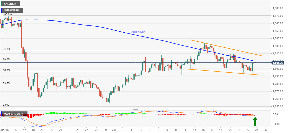 Gold prices stay on the way to $1,810 resistance confluence comprising 200-SMA and 50% Fibonacci retracement of June’s fall.