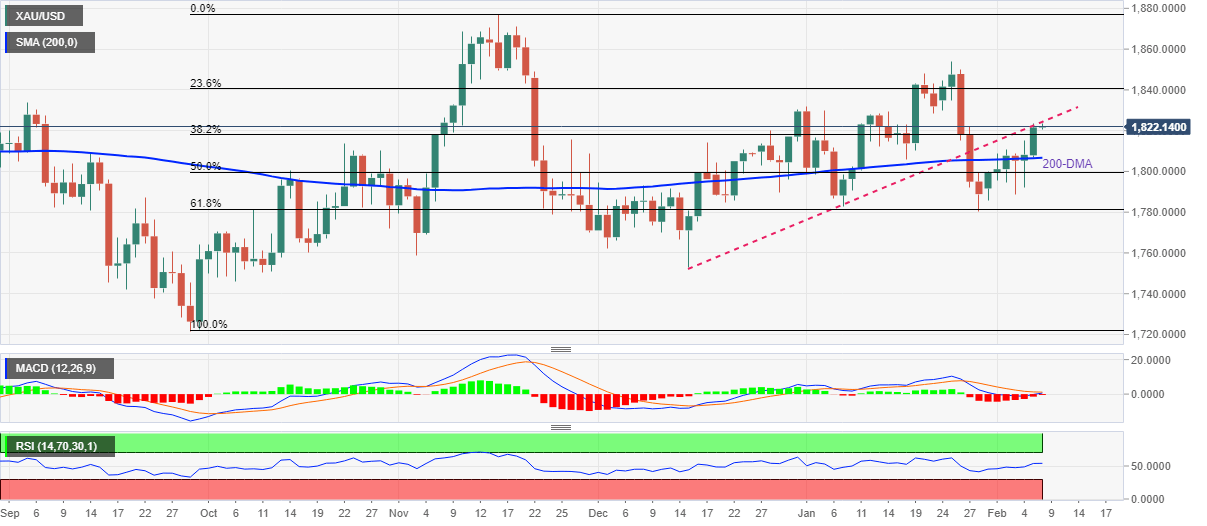 Gold extends late January’s rebound from 61.8% Fibonacci retracement (Fibo.) of September-November 2021 upside to regain its place above the 200-DMA.