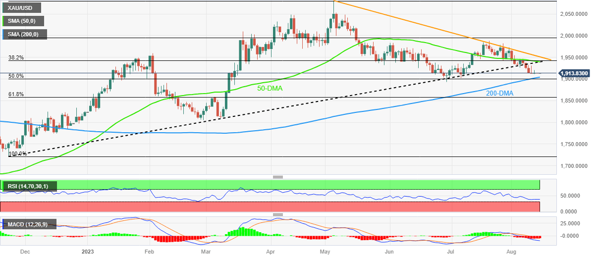 Gold Price remains on the back foot around $1,910, comprising the 61.8% Fibonacci retracement of late February to early May upside, after witnessing a three-week downtrend.