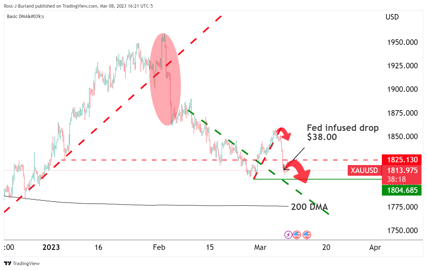 Meanwhile, Gold price is heavy due to the DXY Dollar index rising to the highest since December after Fed's Powell said in Tuesday's Senate testimony that the US economy is shrugging off higher interest rates and emphasised that the Fed was ready to raise rates higher and faster to slow growth and lower inflation. The ICE dollar index was last seen printing 105.66, making gold more expensive for international buyers. Bond yields were also higher, bearish for the metal since it offers no interest. The US 10-year note was last seen paying 3.979%.