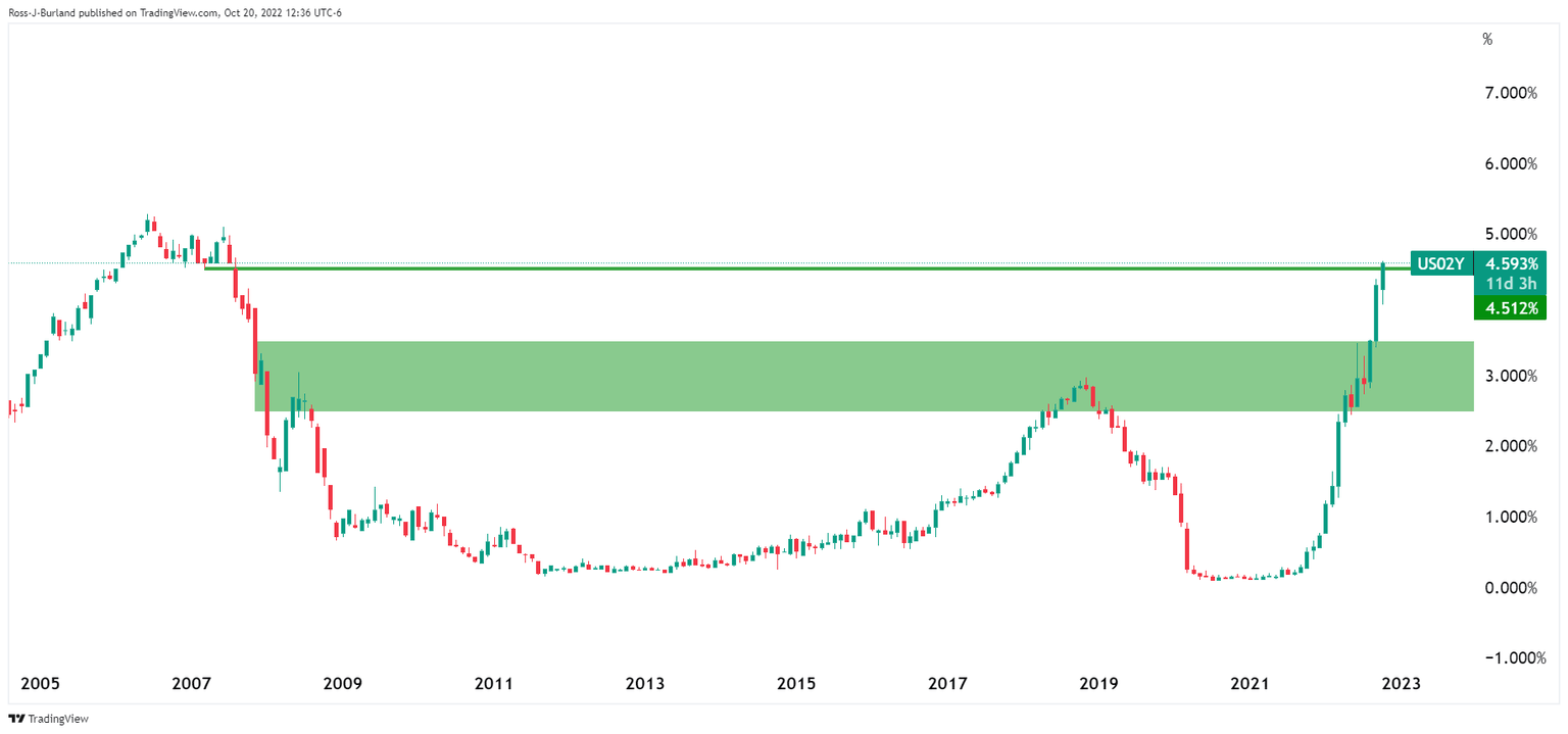 Bond yields rose, with the US 2-year note last seen paying 4.593%, up 0.75%, after reaching to the highest since 2008 at 4.614%: