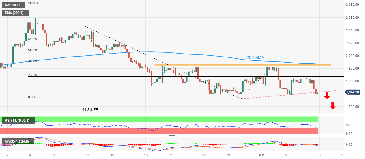With a clear downside break of the aforementioned support line, now resistance near $1,943, the Gold Price confirms a fall toward the monthly, as well as the yearly low, marked in the last week around $1,932.