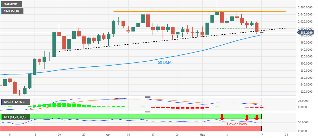 Gold Price (XAU/USD) holds lower grounds at a two-week bottom surrounding $1,990 early Wednesday, after breaking the key short-term support lines during the previous day’s fall. That said, the yellow metal bears the burden of the strong US Dollar, as well as upbeat United States data, while failing to justify the optimism surrounding the US debt limit extension.
