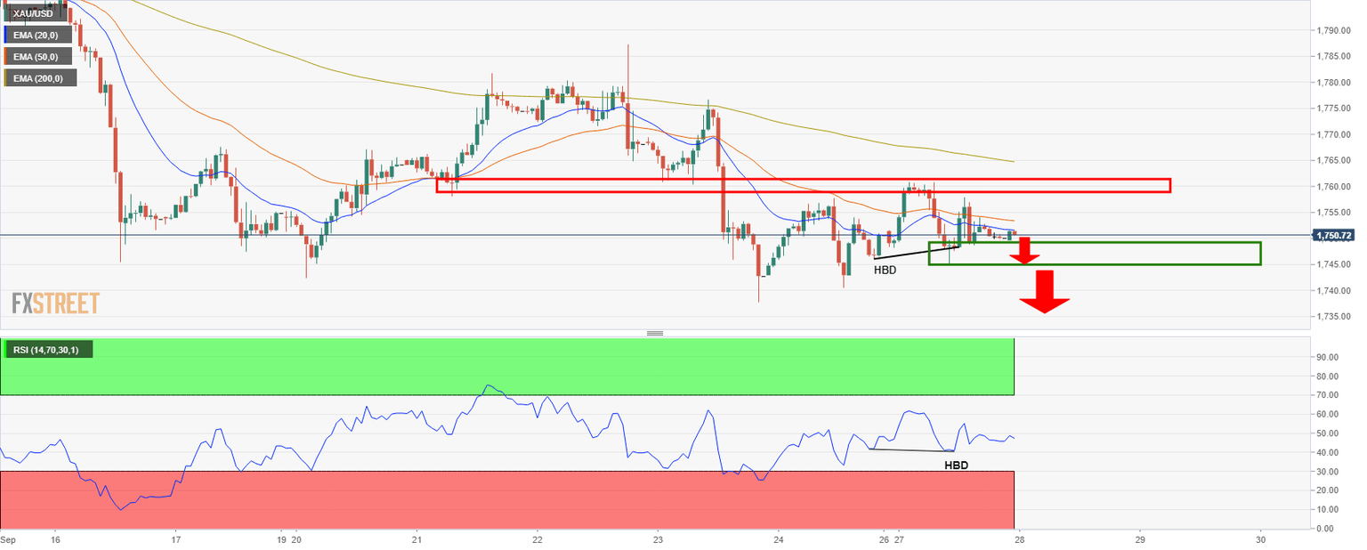 Gold has recently enjoyed some hidden bullish divergence on the hourly time frame which has given the yellow metal some support in the US session. Gold on Wall Street travelled between a low of $1,744.88 and $1,760.91 on the day so far. Nevertheless, the pressure is on for the bulls with the price technically bearish below the 4-hour 200, 50 and 20 EMAs that are aligned bearishly with RSI below 50. See more on that below under, Gold, technical analysis.