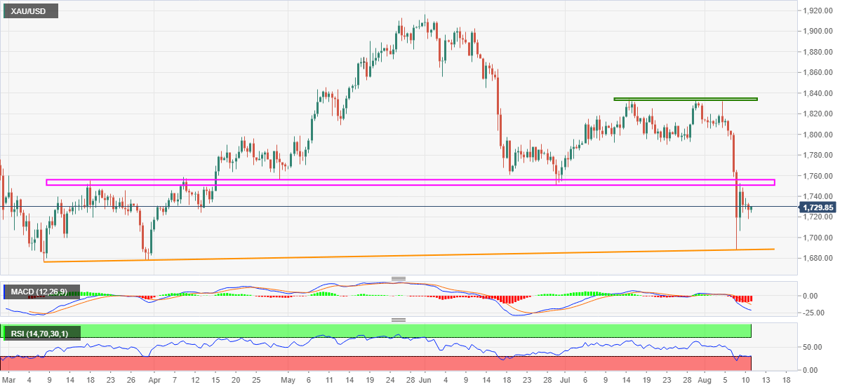 Gold (XAU/USD) bounces off intraday low towards regaining $1,730 level, up 0.06% on a day during a bearish consolidation play amid early Wednesday. Even so, the yellow metal remains on the back foot, fading the corrective pullback from the multi-day bottom, marked on Monday, amid broad US dollar strength.