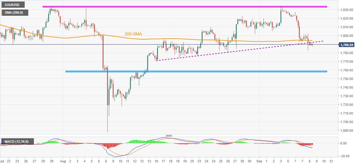 The breakdown gains acceptance from the bearish MACD signals to direct sellers towards the mid-August lows near $1,770 during the fall to monthly support near $1,758.