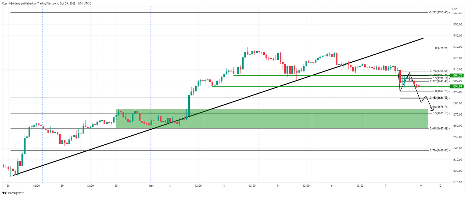 The gold price dropped from a high of $1699.91 from the get-go this week, sliding in Asia and not looking back, pausing for only a brief hourly candle in European markets and at the open of New York forex trade at around $1,677. However, with an elevated US dollar and US yields reaching for blue skies, gold bulls had no choice but to capitulate, making way for a strong second wind from the bears during Wall Streets' first few hours of trade.