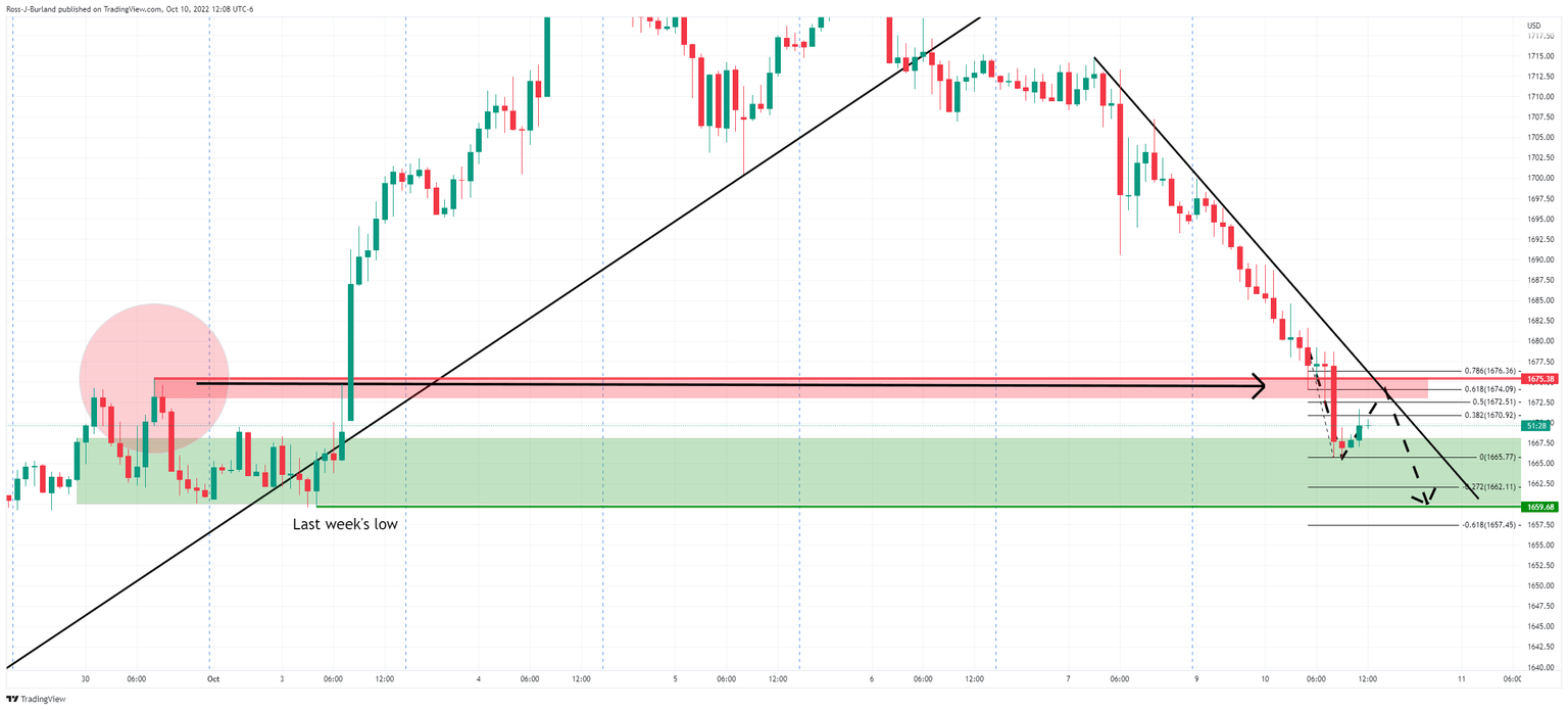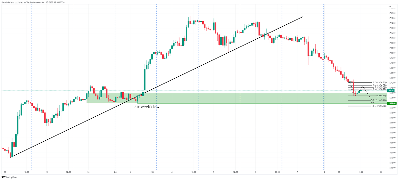 The gold price, as per the start of the week's pre-open analysis, Gold, the Chart of the Week: XAU/USD bears eye a run to key support near $1,675, US CPI eyed, has dropped significantly lower on Monday. Not only did the price take out $1,675, but it has also made a low of $1,665.77, taking on a key support area as the markets stay on the theme of a hawkish Federal Reserve.