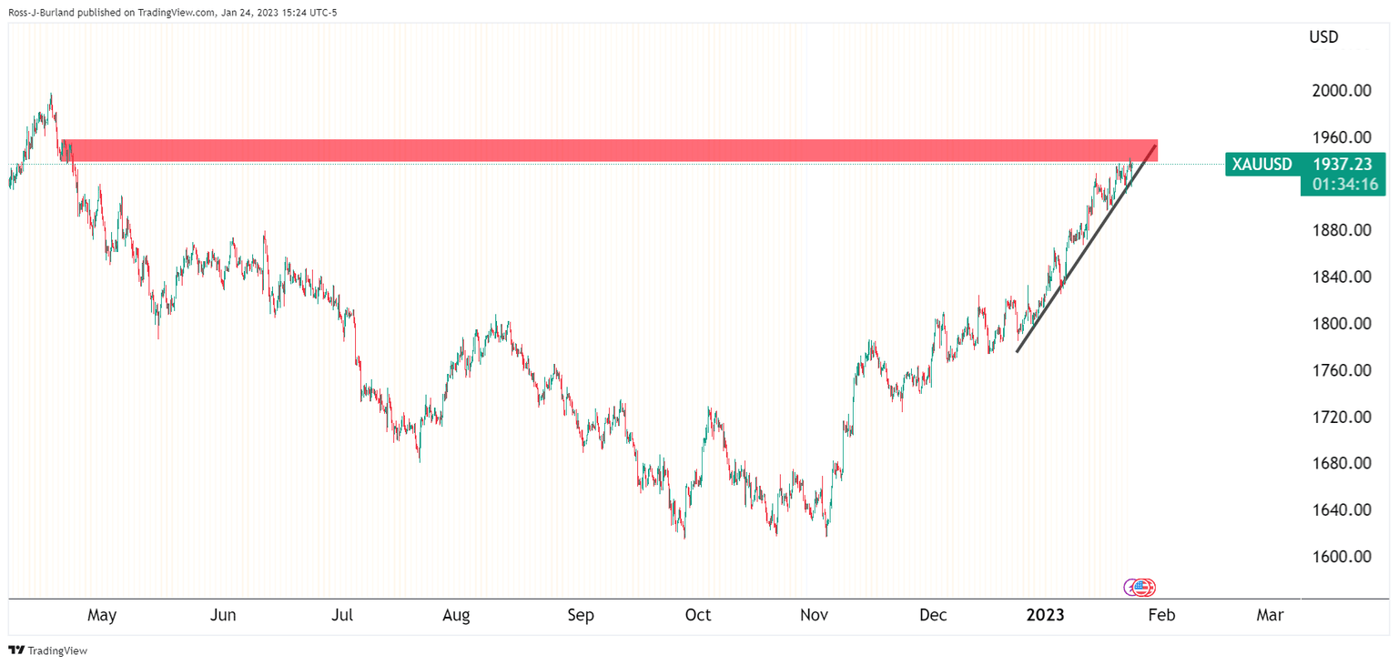 Investors are banking on the Federal Reserve raising rates by 25 basis points (bps) at the January 31 - February 1 policy meeting, after slowing its pace to 50 bps in December, following four straight 75-bp hikes. Meanwhile, the Gold price tends to benefit due to lower interest rates that otherwise decrease the opportunity cost of holding the non-yielding asset.