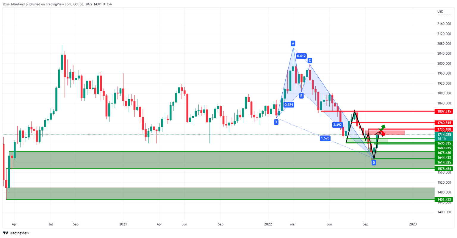 Overall, the yellow metal has been more robust of late, making its way back into the $1,700's this week, recovering from last month's lows that were made as US bond yields surged to multi-year highs. The sentiment surrounding the Federal Reserve has been the driver, as fickle as it is. However, with data ebbing and flowing in and out of the inflationary territory, the yellow metal has been able to benefit at times of less hawkish speculation surrounding the Fed's next moves with participants betting on a pivot at the start of the week.