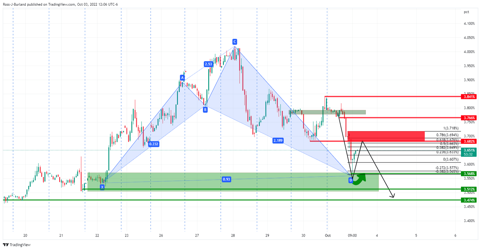 The US dollar has eased, helping demand for the greenback-priced bullion among overseas buyers. DXY, an index that measures the greenback vs. a basket of currencies is now down some 0.2% after falling from a high of 112.543 to a low of 111.470. This softness in the safe-haven currency has afforded gold some respite that has staged a mini-recovery after dropping to its lowest since April 2020 on Sept. 28. The benchmark US 10-year Treasury yields have also fallen and are now making an advance on key support structure: