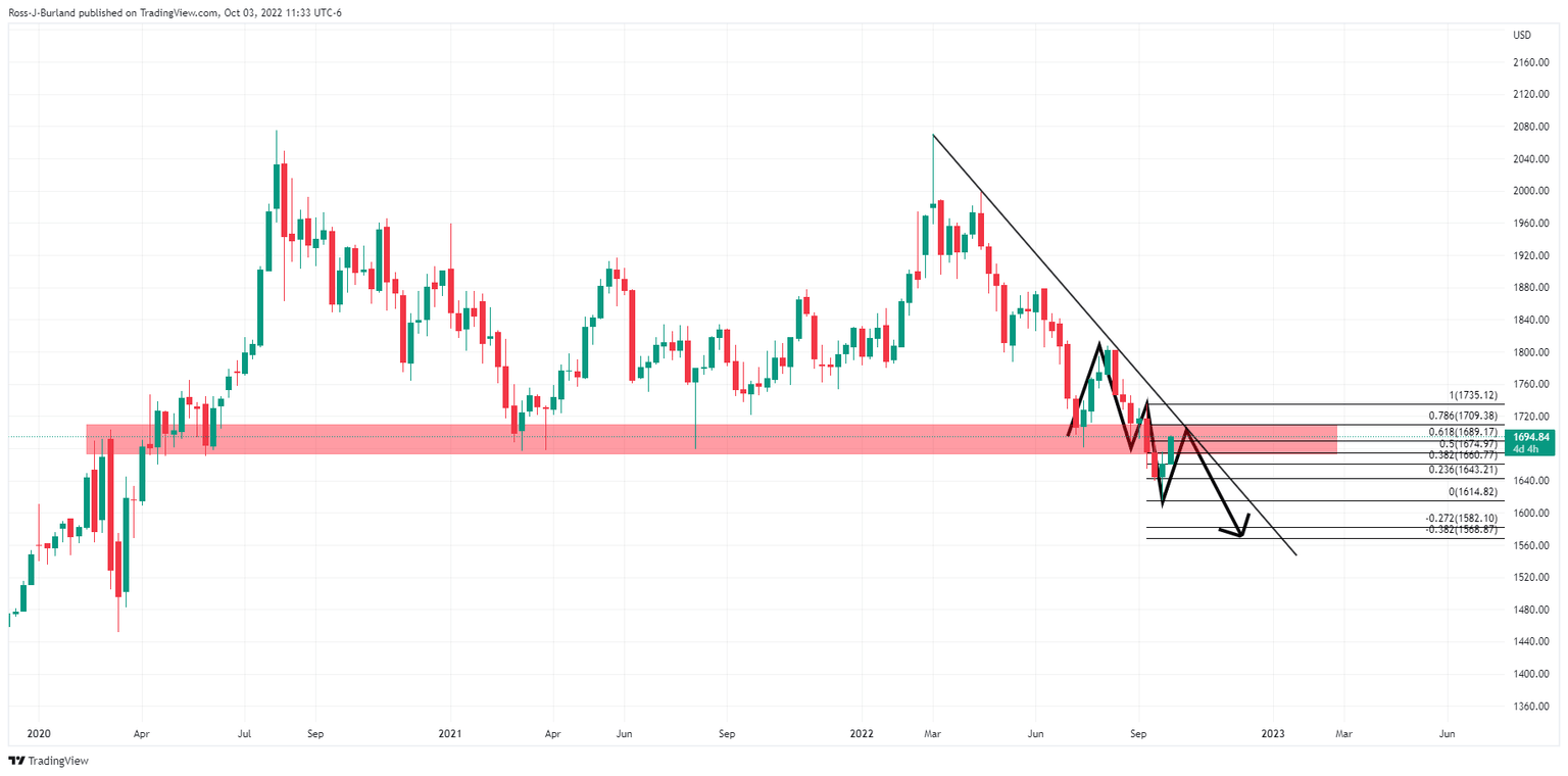 The daily charts above illustrate the price's trajectory below trendline resistance, on the way to the 78.6% Fibonacci retracement level near $1,710/oz. If resistance holds, then the price would be expected to continue with its southerly trajectory. On the other hand, should the bulls stay committed, then a break of resistance structure could lead to a significant upside continuation as per the bullish harmonic crab pattern: