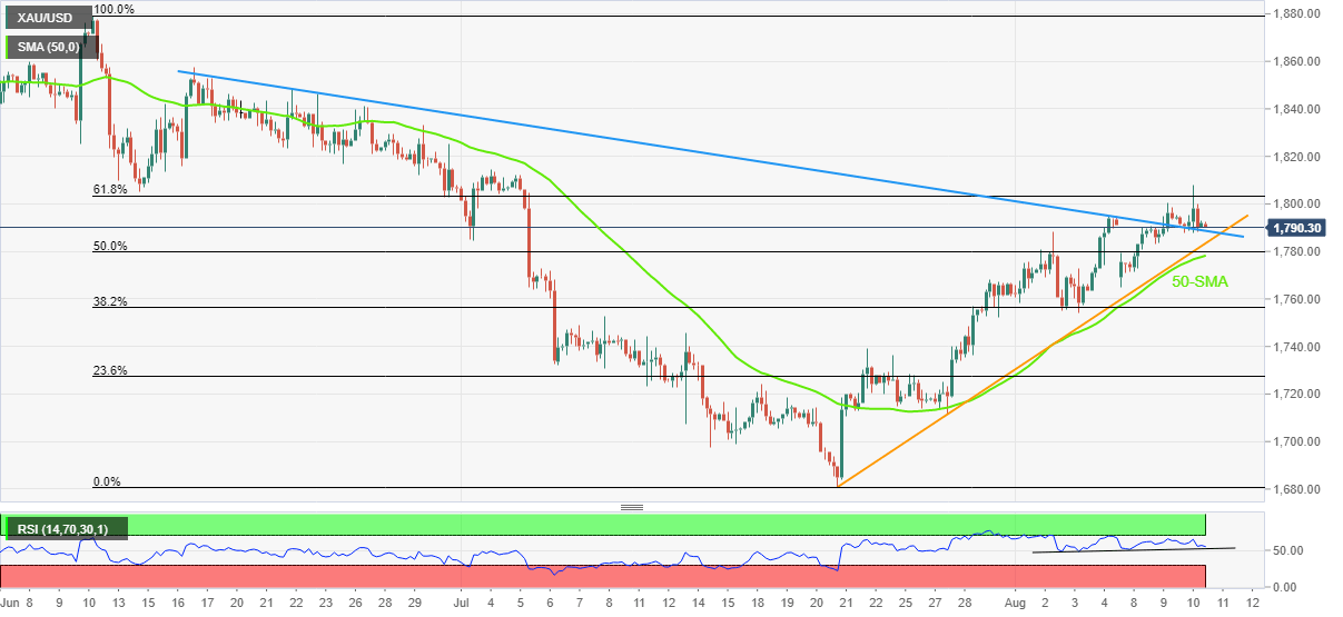 It’s worth noting that, the commodity’s downside break of the resistance-turned-support, near $1,788, isn’t a call to the gold sellers as a three-week-old ascending support line and the 50-SMA, respectively near $1,783 and $1,777, could challenge the quote’s further weakness.