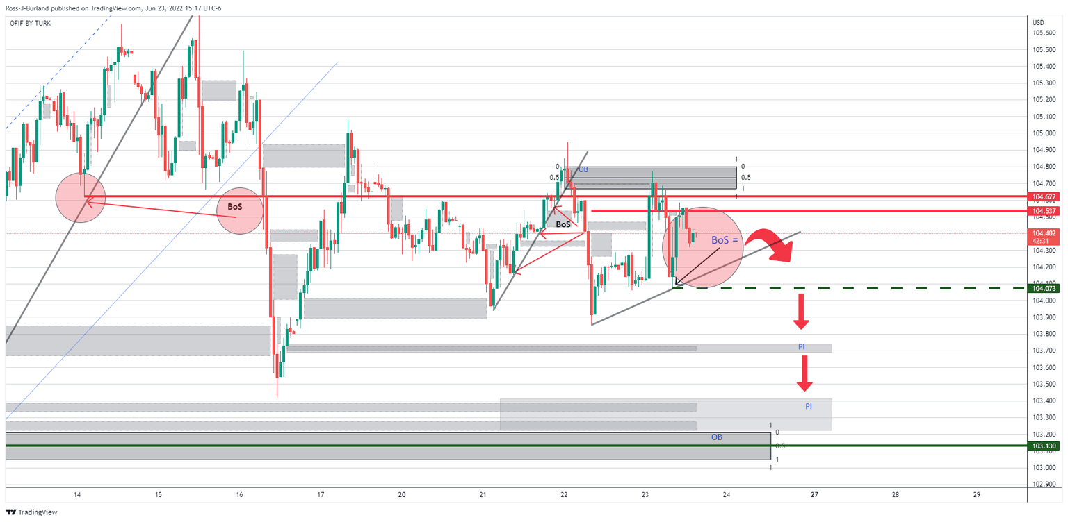 In the above analysis, the greenback was forecasted to break the structure and head lower to the area of imbalance of price towards 103.00.