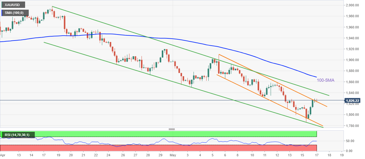 Gold prices defend the early-day break of a one-week-old descending trend channel. The bullish chart confirmation joins a firmer RSI line to push further towards an upper line of the downward sloping channel from April 18, close to $1,842 by the press time.