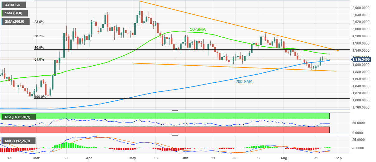 Gold Price not only managed to post the first weekly gain in five but also regained its place beyond the $1,910 support confluence comprising the 200-day Simple Moving Average (SMA) and 61.8% Fibonacci retracement of February-May upside.