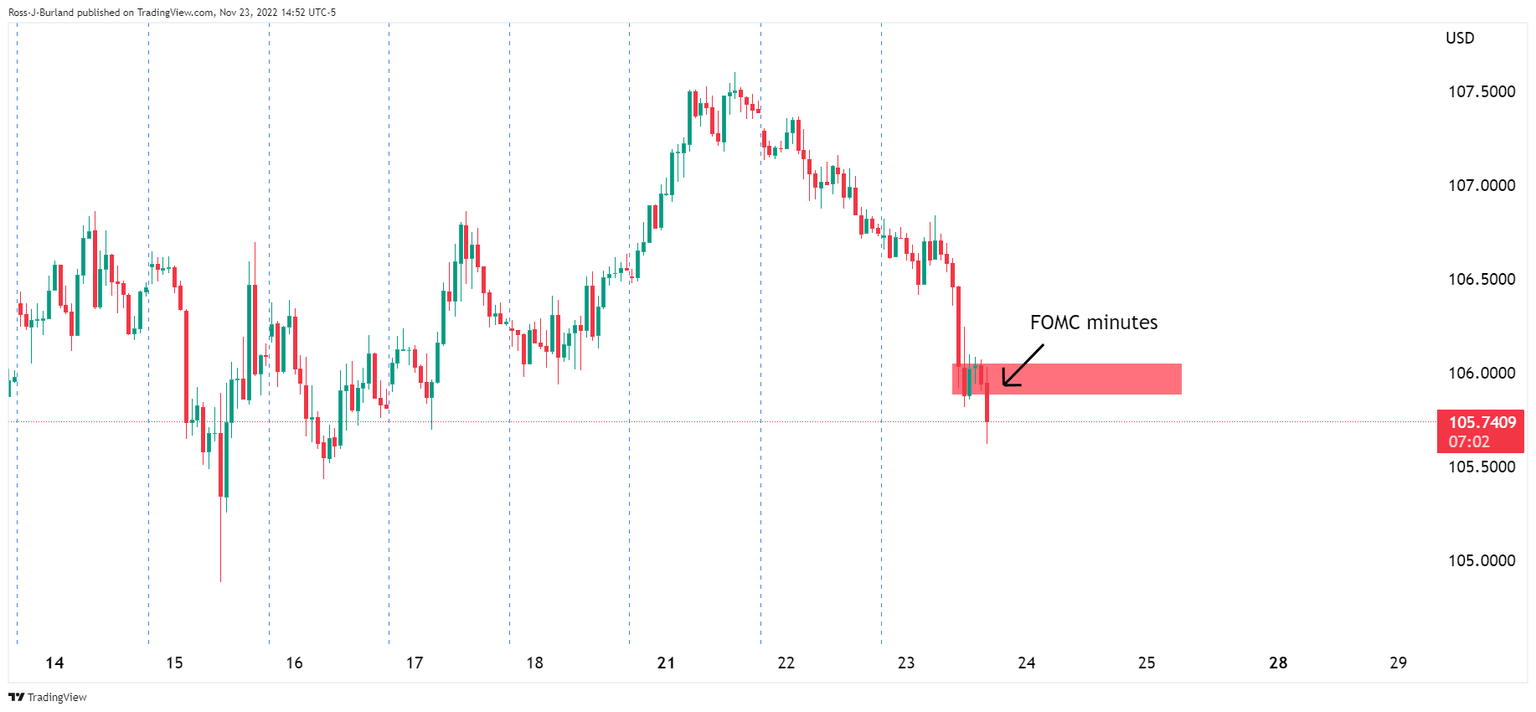 The US Dollar index, as a consequence, has fallen more than 1% toward 106, the lowest since mid-August, as traders raise bets of only a 50 bps rate hike by the Fed in December.