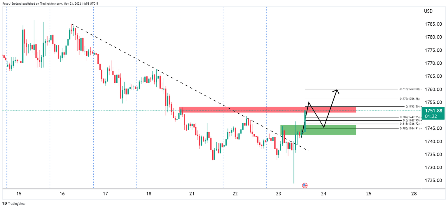 The price has shot higher into resistance and the bulls will look for a discount on the backside of the trendline for a higher price ahead. With the Thanksgiving holidays, markets have fewer participants and hence there is little in the way of a follow-through so far.