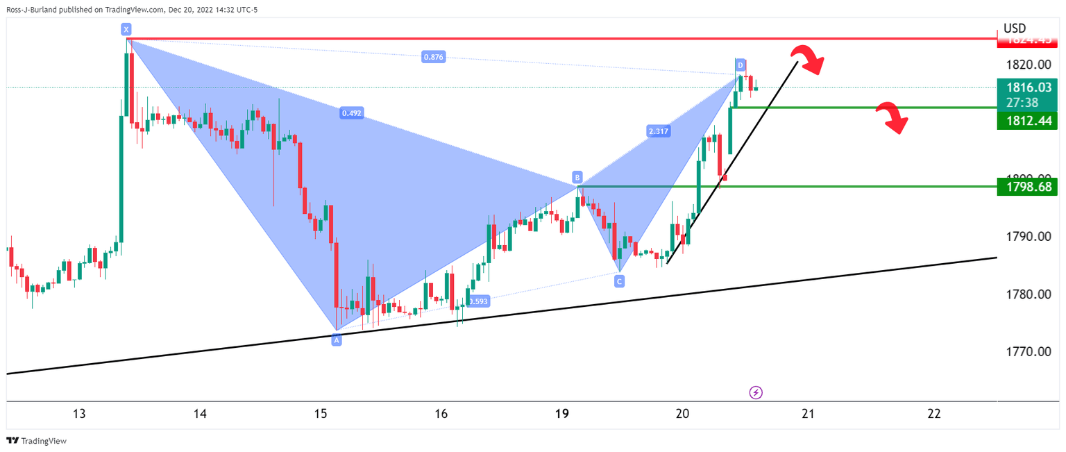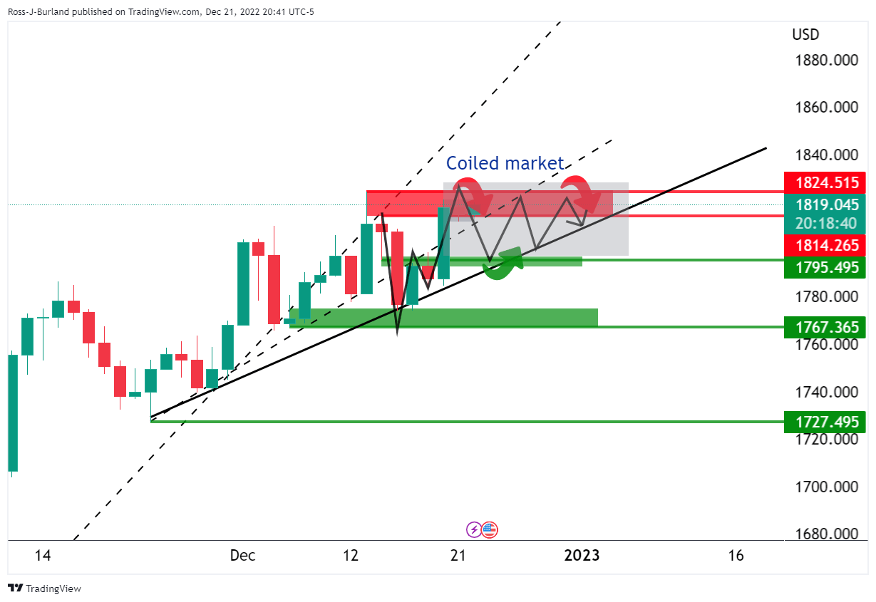 In a series of prior analyses, it was stated that the Gold price 1-hour picture was bearish while below the resistance near $1,825 and on the backside of the micro trendline and there are eyes on eyes on $1,795.