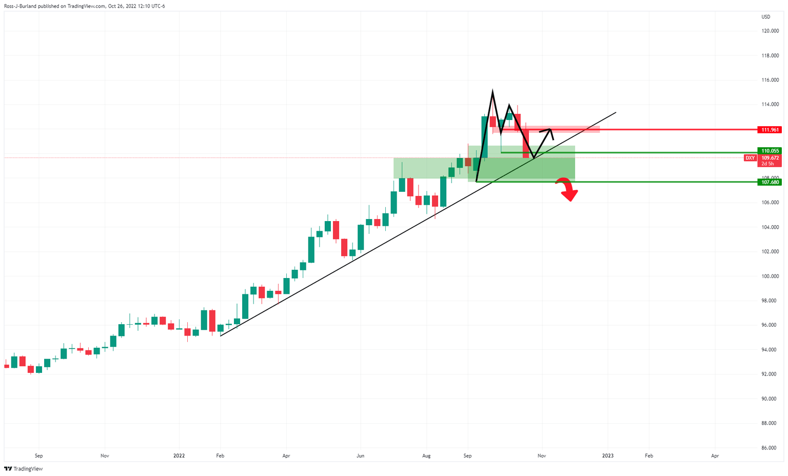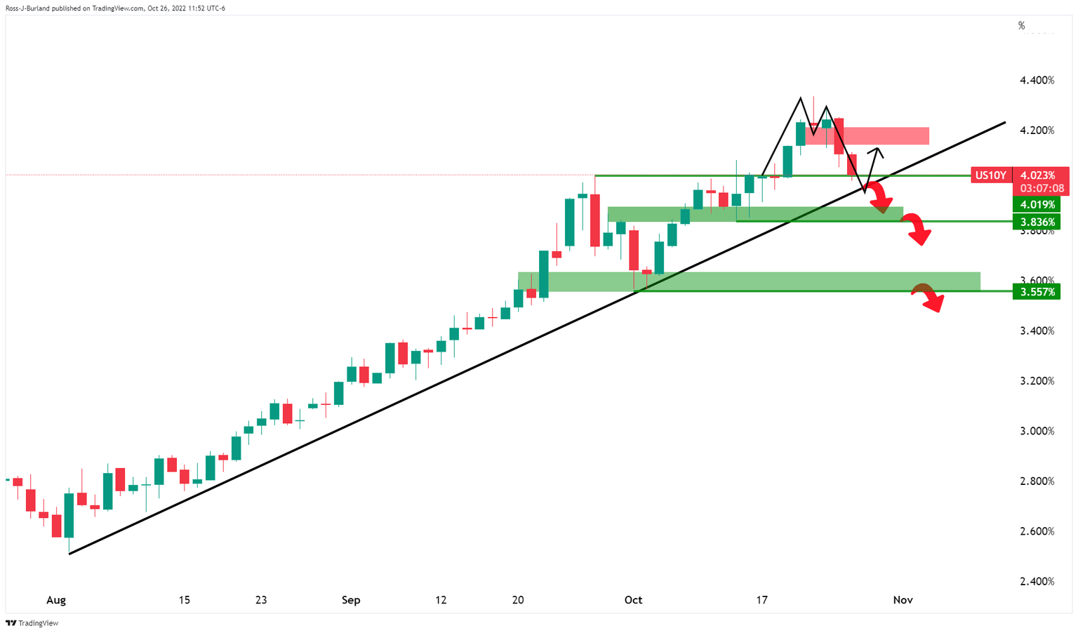 At the time of writing, XAU/USD is trading at $1,665 having travelled between a low of $1,649.81 the low and $1,675.00 the high. The DXY, an index that measures the greenback vs. a basket of currencies is losing some 1.00% on the day having dropped from a high of 111.135 to a low of 109.649 while the US 10-year yield is down 1.95% from a high of 4.113%, clinging on to 4%, just a touch above the lows of 3.997% as it moves in on technical support: