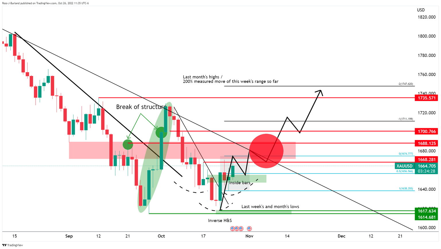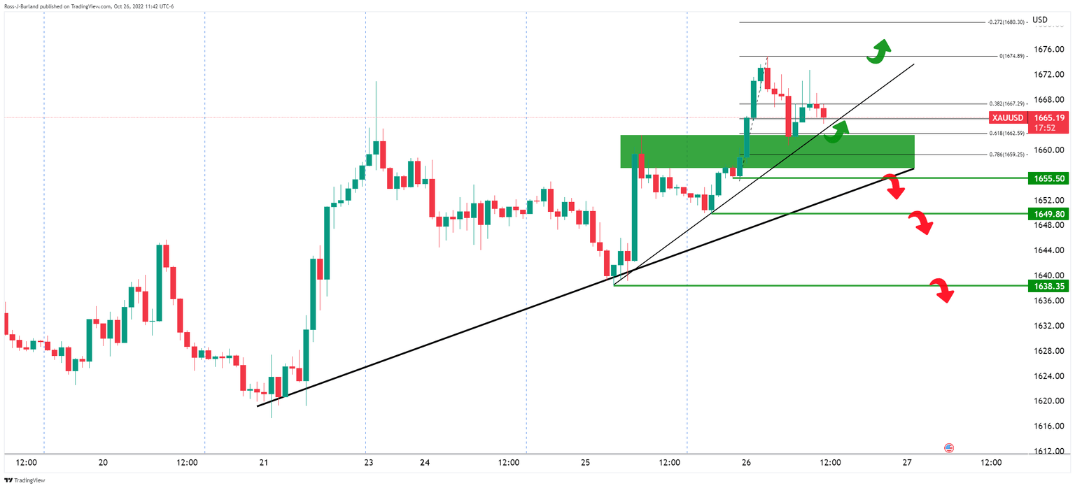 The daily chart, above, shows a number of bullish confluences. We had a break in daily structure back on Oct 3 to take the gold price on the back side of the daily trendline resistance. The price moved back into Wednesday 22 Sep bullish peak formation lows in a micro daily bear trend. We have broken on the backside of the micro (secondary) daily trendline on Fri 22 Oct and we have two prior inside days that are being broken today (bullish). This could be cementing the formation of an inverse head and shoulders for a 150% measured move of this week's range so far to target last month's highs of near $1,735. A close above the $1,670 neckline could be the trigger point to start looking for the set-up on lower time frames.
