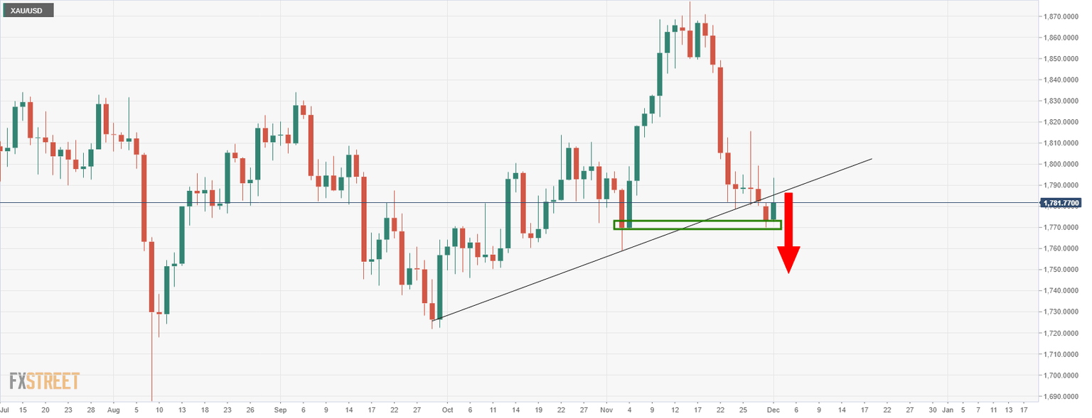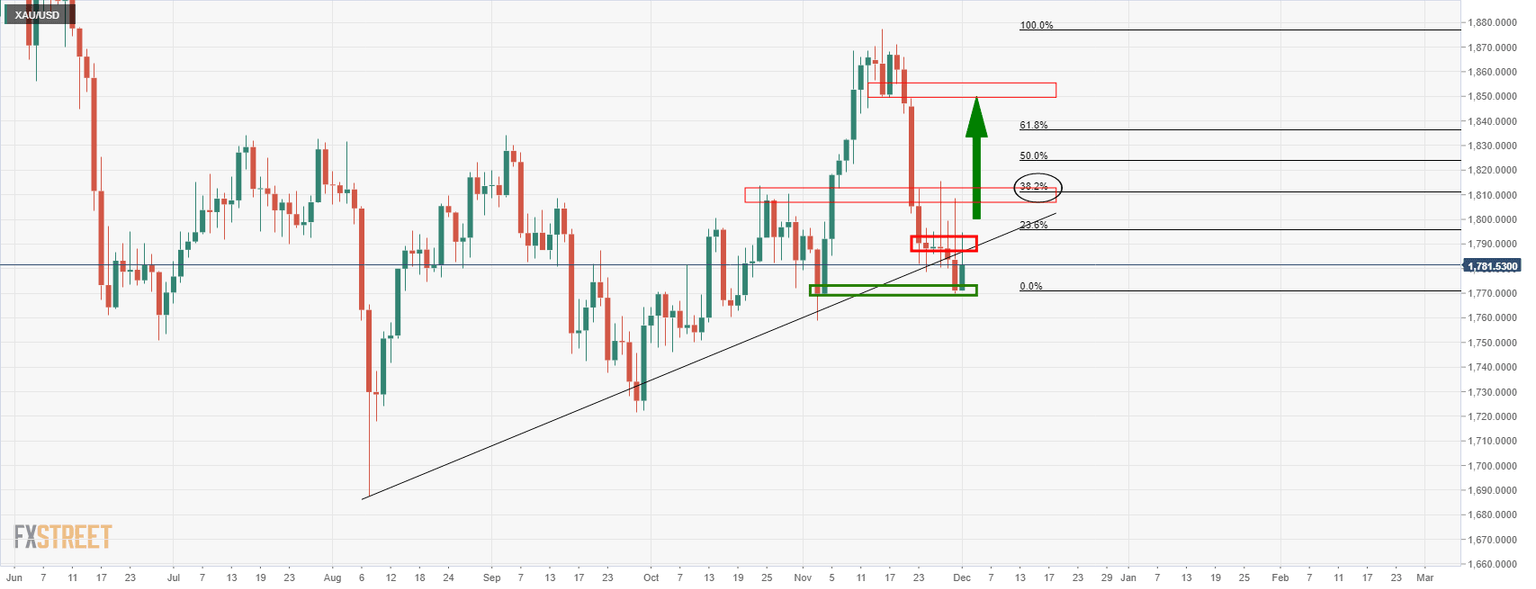 Bulls will need to get above the 38.2% Fibonacci ratio resistance near $1,810 for a run to the neckline of the M-formation near $1,850 for the days ahead.