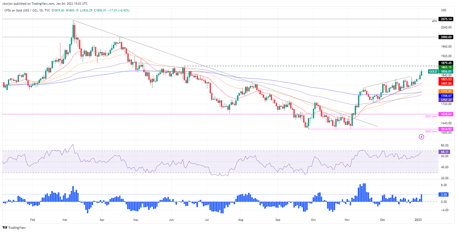 Gold price rallied to eight-month highs around $1,865.15, though slightly retraced some of its gains amidst an upbeat market sentiment, spurred by China’s support to its housing market, alongside its border reopening, as it relaxes Covid-19 zero-tolerance measures. Investors get ready for a busy economic calendar in the United States (US), while Federal Reserve’s (Fed) officials began to cross newswires. At the time of writing, the XAU/USD is trading at $1,856.01, above its opening price by 1%.