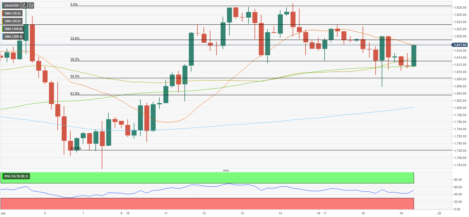 $1,820 (Fibonacci 23.6% retracement of the latest uptrend) aligns as first resistance. In case the pair manages to flip that level into support, it could target $1,824 (static level) and $1,830 (static level). On the downside, supports align at $1,810 (100-period SMA), $1,808 (Fibonacci 50% retracement) and $1,804 (Fibonacci 61.8% retracement).