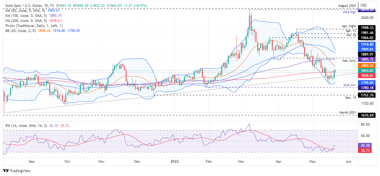 Although it is above the 200-DMA, which lies at $1838.61, Friday’s Gold price action is still vulnerable to further selling pressure. XAU/USD’s bulls, to ease the downward pressure, need to reclaim the 20-DMA at $1858.41, a level that would leave Gold comfortably trading in the $1838-58 range, before finding a fresh impetus to continue its climb towards the 100-DMA at $1885.75.