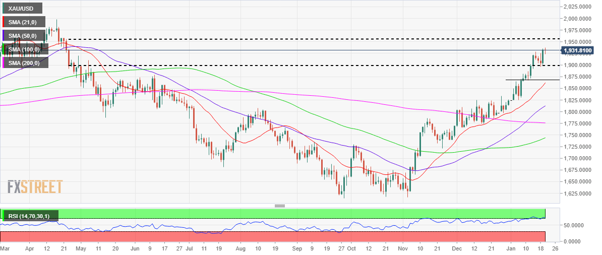 Gold price is retreating from the highest level seen in nine months at $1,938 in the Europen session, as the renewed uptick in the US Treasury bond yields is aiding the recovery in the US Dollar. Meanwhile, the US Dollar also seems to benefit from cautious optimism, amid dovish Federal Reserve expectations, mixed US corporate earnings reports and weak domestic economic data.