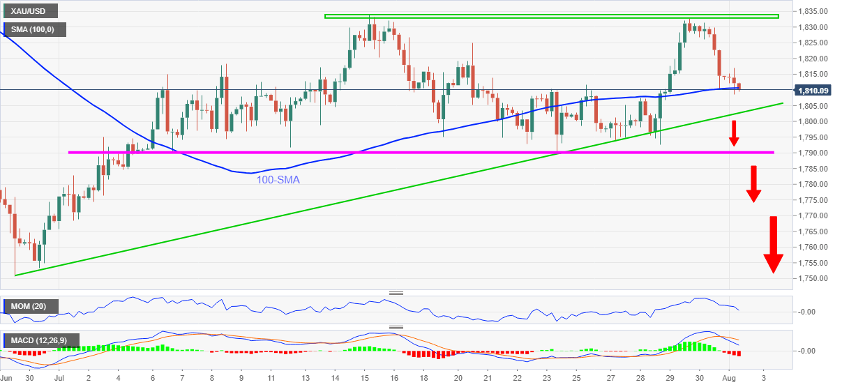 Previous update: Gold (XAU/USD) kick-starts August with mild losses of 0.22% intraday, around $1,810 heading into Monday’s European session. The yellow metal managed to post a positive weekly closing by the end of Friday amid broad US dollar weakness. However, cautious sentiment ahead of this week’s US Nonfarm Payrolls (NFP), not to forget today’s US ISM Manufacturing PMI, for July weigh on the commodity prices.