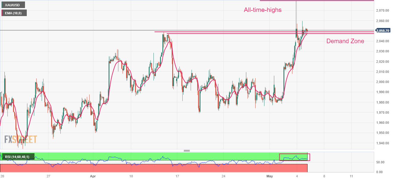 Gold price is building a base near the demand zone plotted in a narrow range around $2,050.00 on a two-hour scale. The precious metal fell sharply after printing an all-time high of $2,079.77. The 10-period Exponential Moving Average (EMA) at $2,047.00 is providing cushion to the Gold bulls.